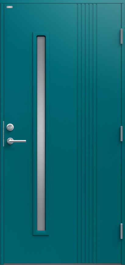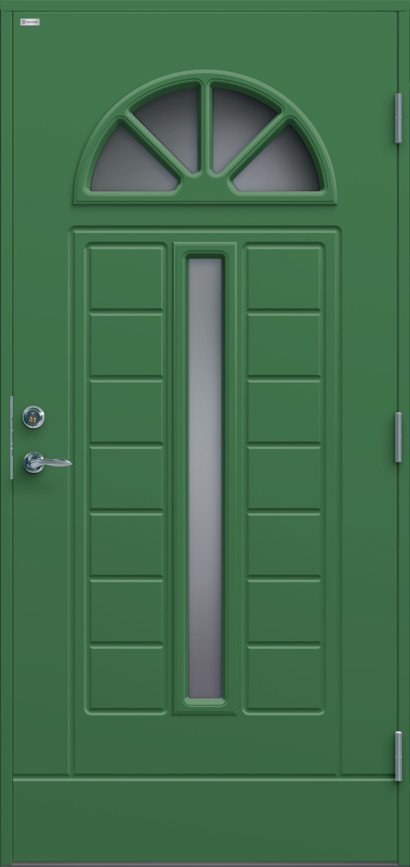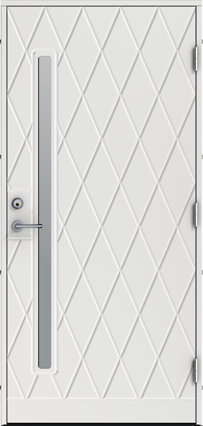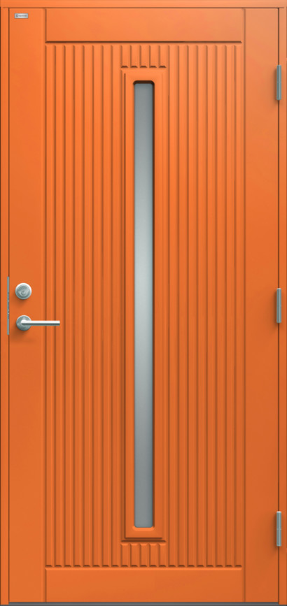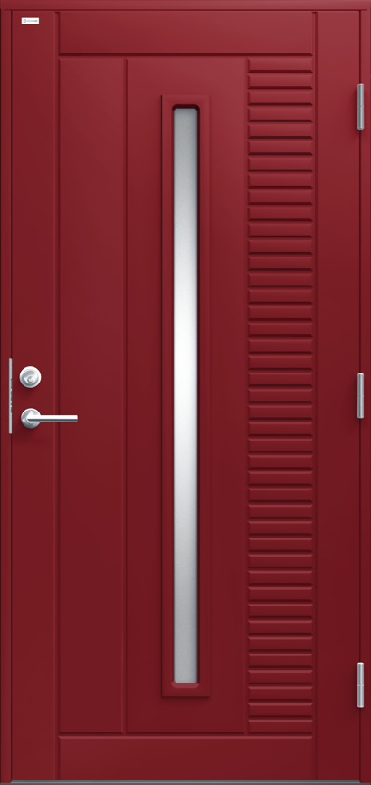 Ytterdörr i modern stil med stående dekorspår och ett smalt, stående klarglas.
