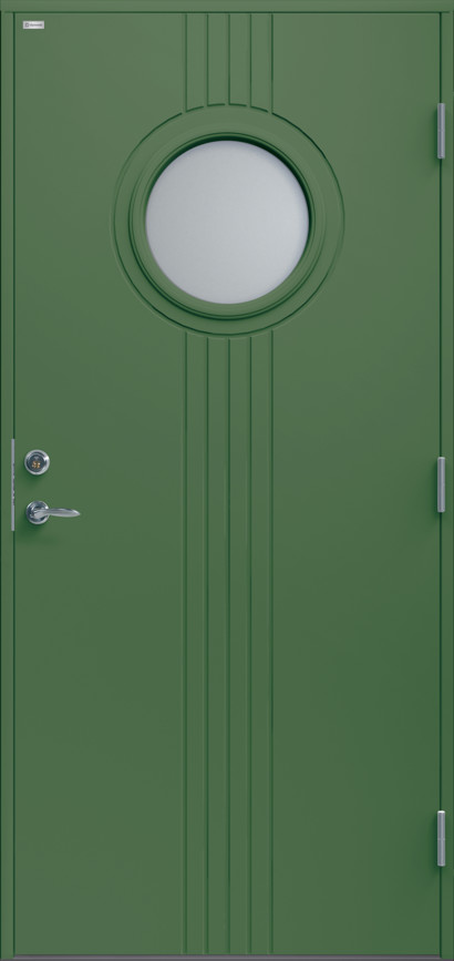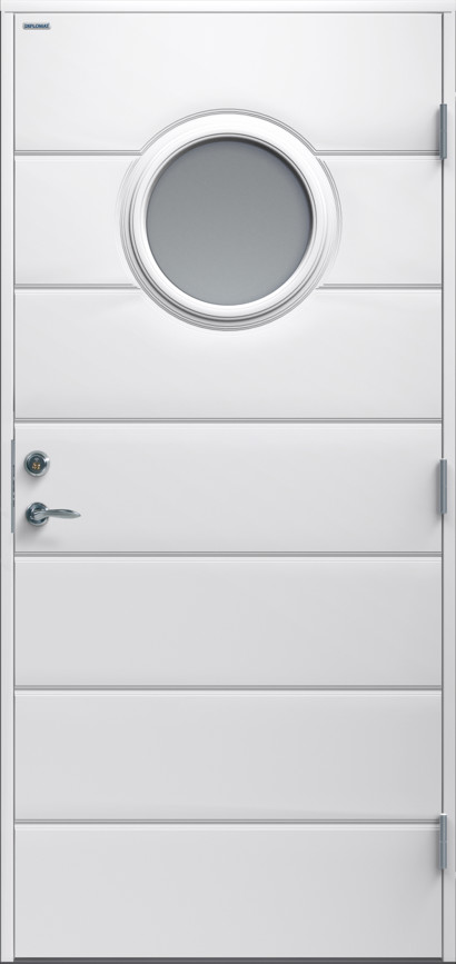 Ytterdörr med helt slät yta utan dekor och runt klarglas. Välj mellan ek, konstteak eller valfri kulör.