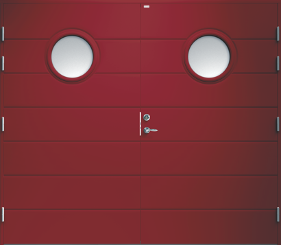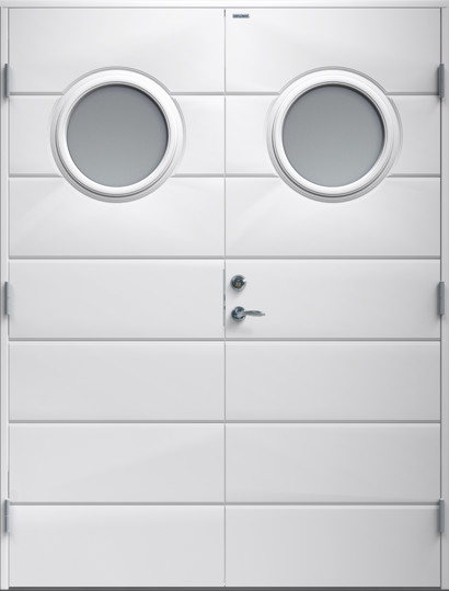 Garagedörr med helt slät yta utan dekor och två runda klarglas.