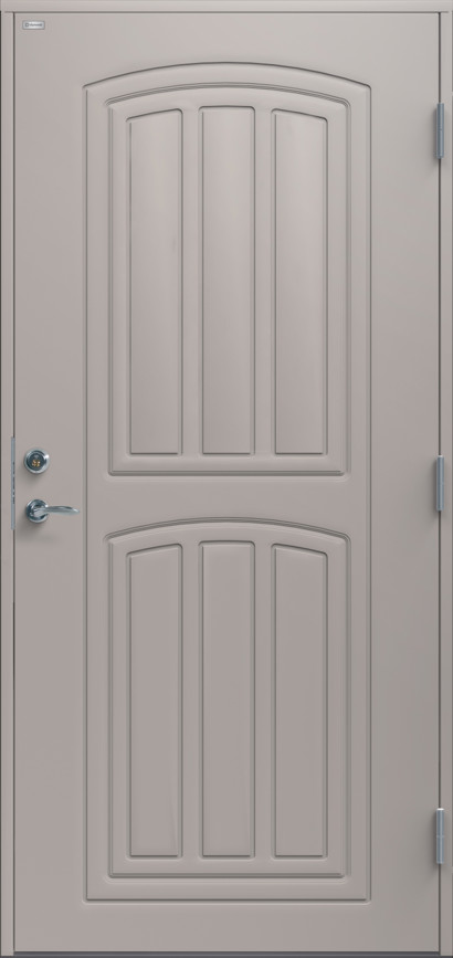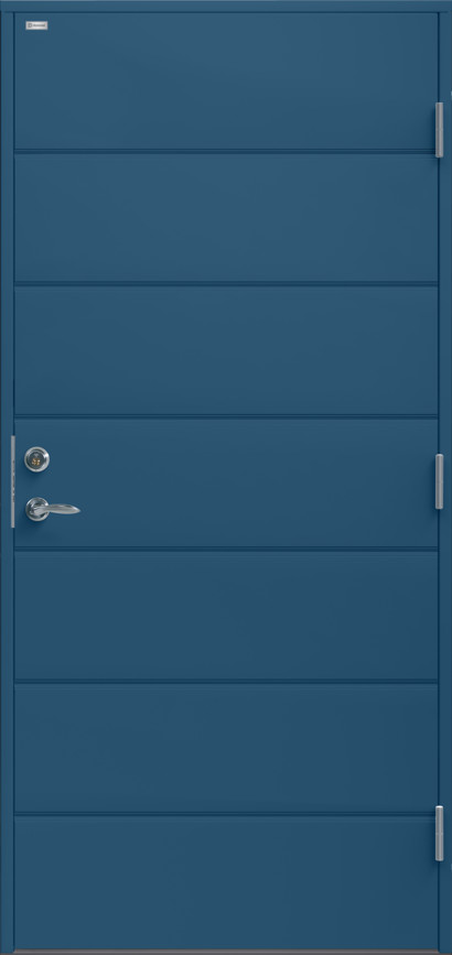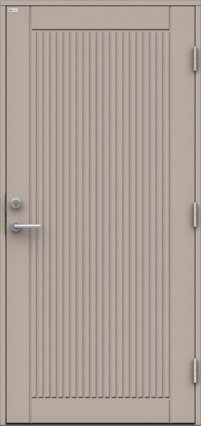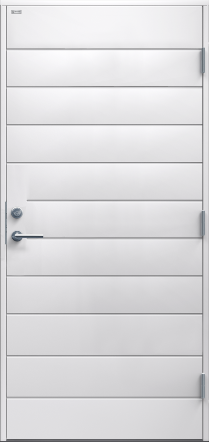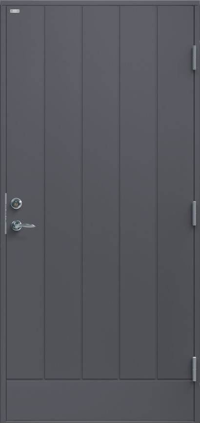 Ytterdörr dekorerad med spårfrästa ribbor med djup profil. Matcha gärna med Afrodite glas, Athena glas eller Nike glas.