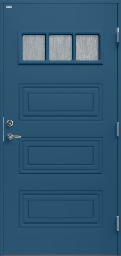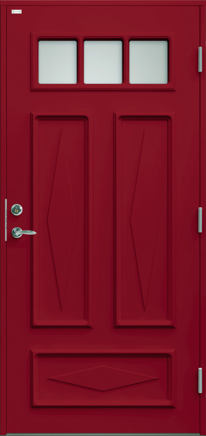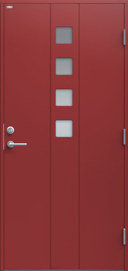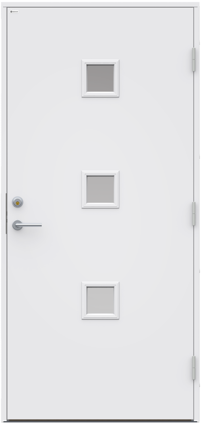 Ytterdörr i modern stil med slät yta utan dekor med tre små, kvadratiska klarglas.