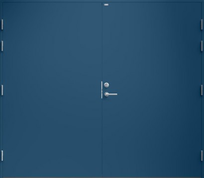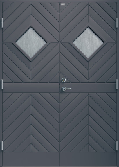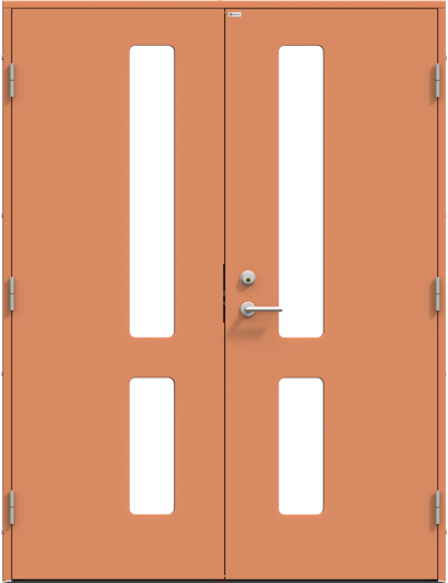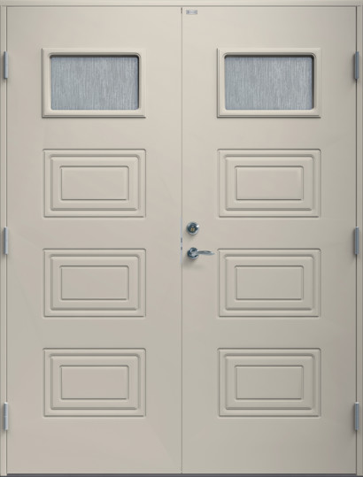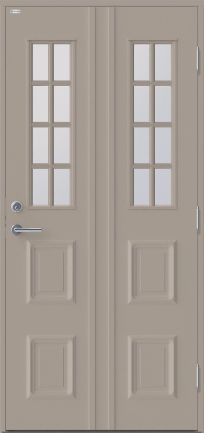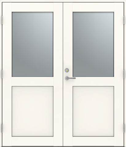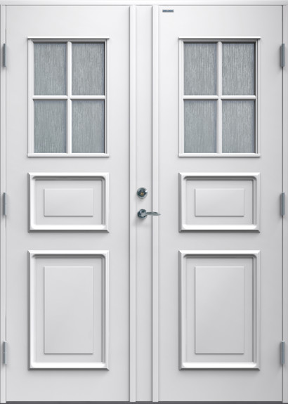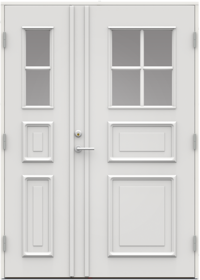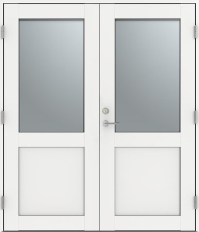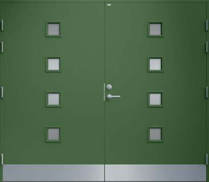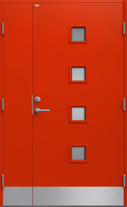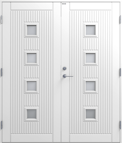 Parytterdörr i modern stil med slät yta utan dekor. Fyra små, kvadratiska klarglas per sida och rostfri sparkplåt.