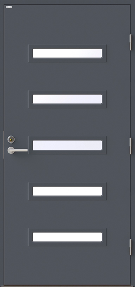 En dörr i modern stil med fem horisontella klarglas. Insidan är falsad, alltså en helt slät insida utan lister.