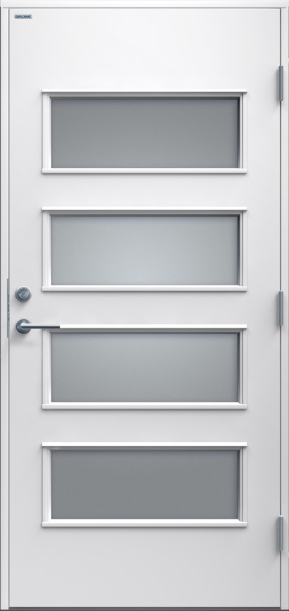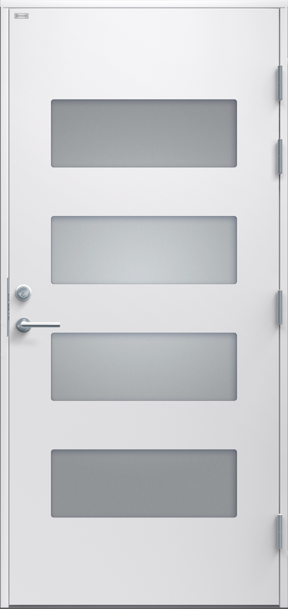 Ytterdörr i modern stil utan dekor. Byggd på laminatskiva som är extra väderbeständig och formstabil. Fyra liggande klarglas i steppat utförande med limmad glaskassett, välj mellan glasram i svart eller silver. Rostfri sparkplåt.
