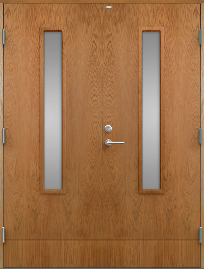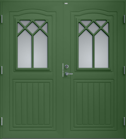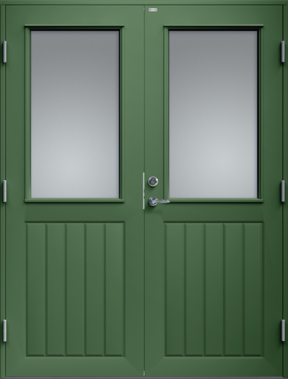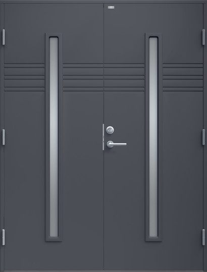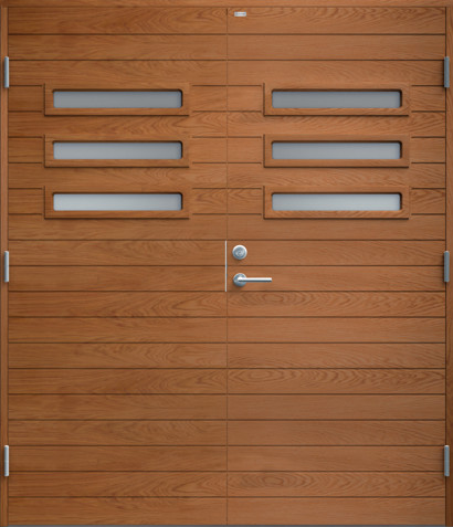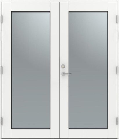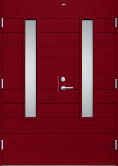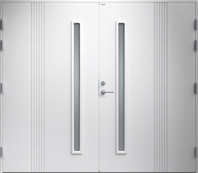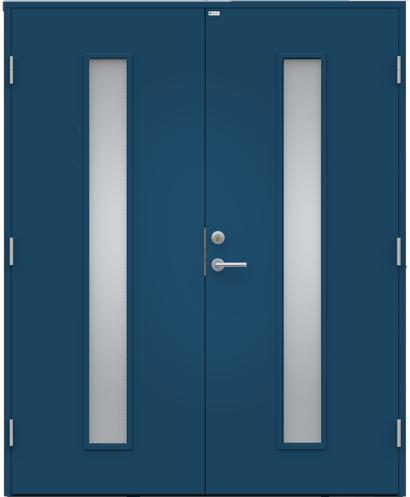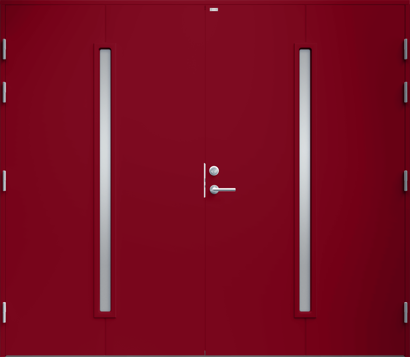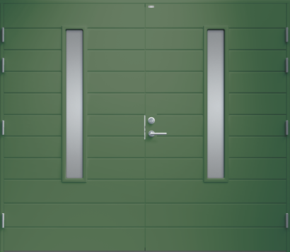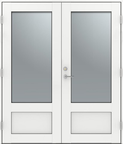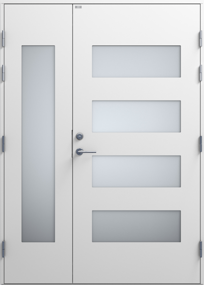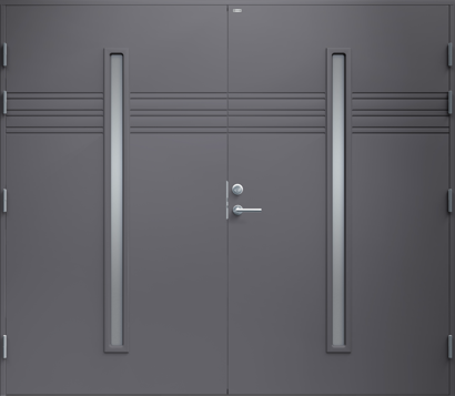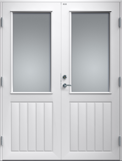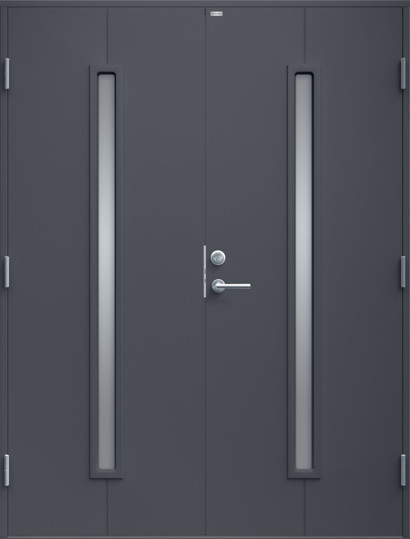 Parytterdörr i modern stil med sparsam dekor. Två smala, stående klarglas.
