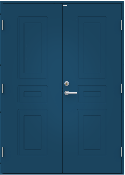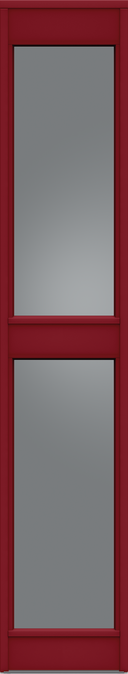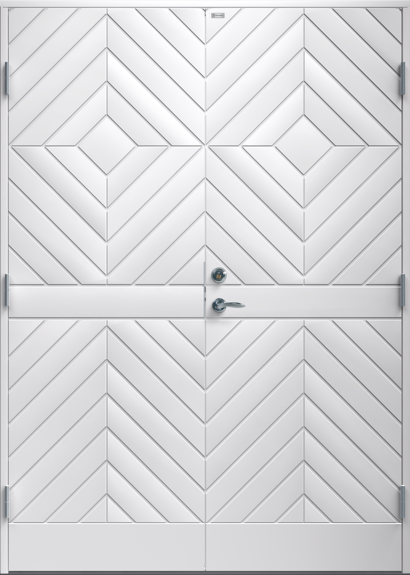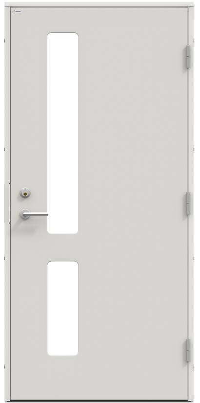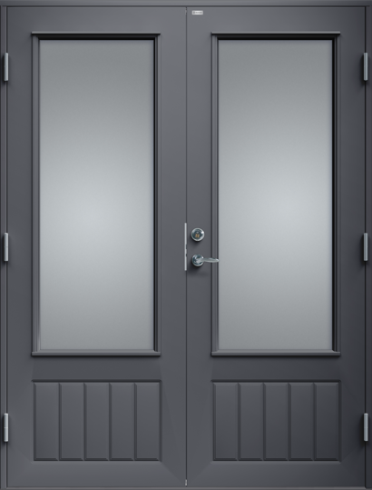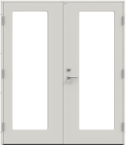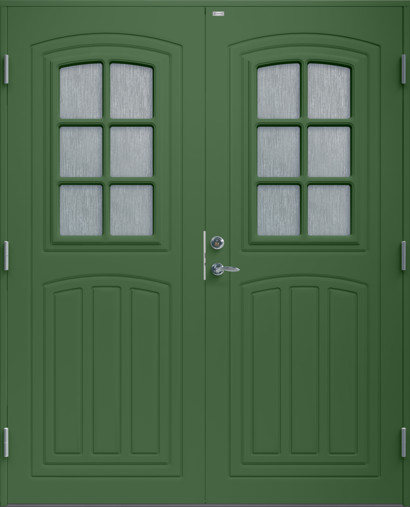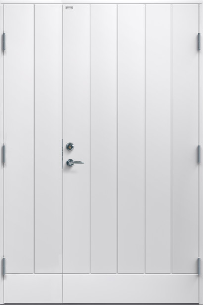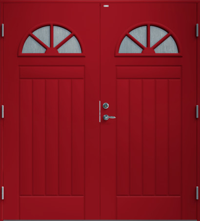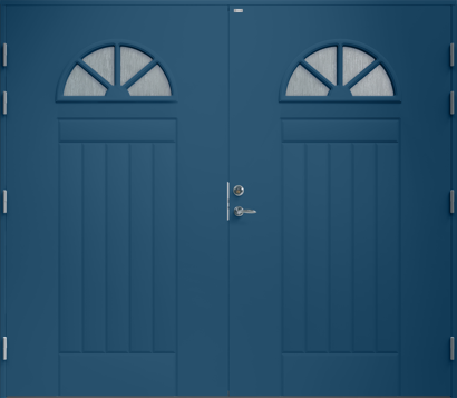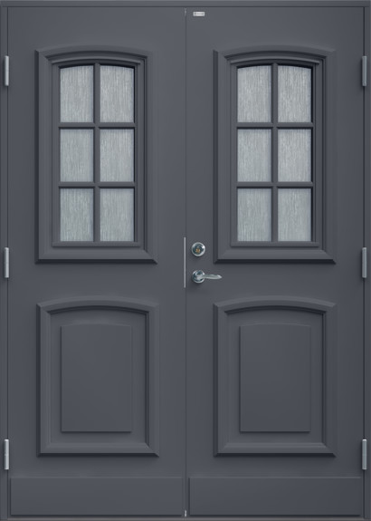 Parytterdörr i modern stil med sparsam dekor. Två smala, stående klarglas.