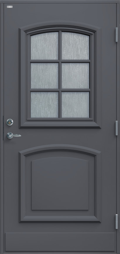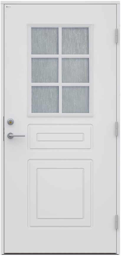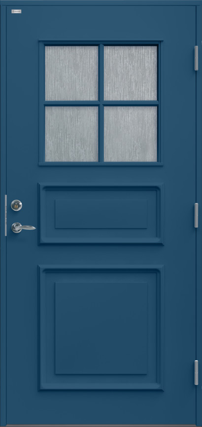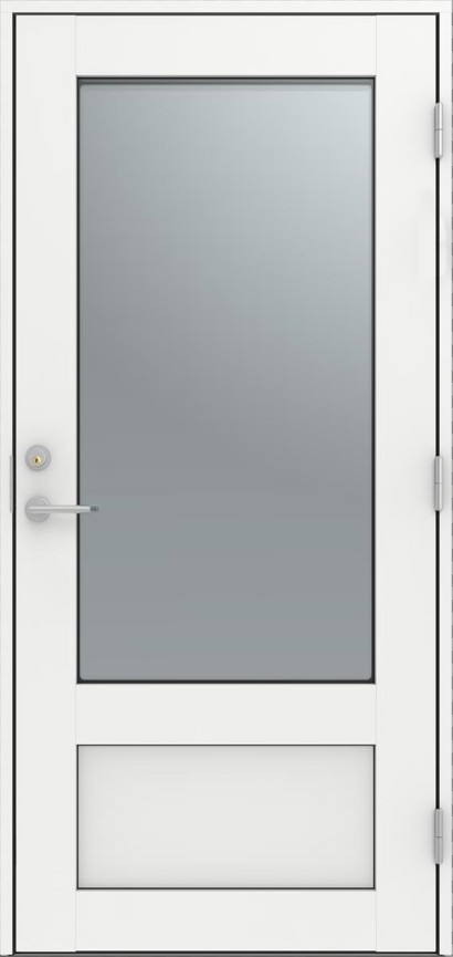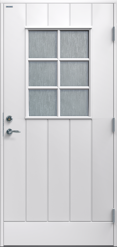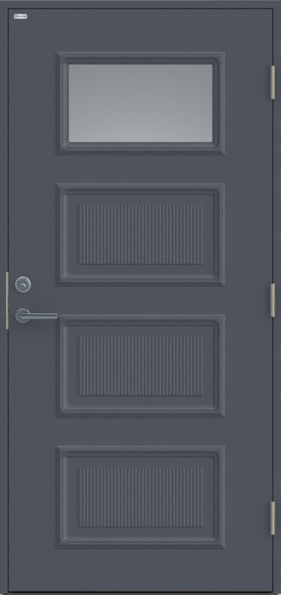 Ytterdörr i modern stil och dekorspår med djup profil i 6mm HDF-skiva. Fyra små, kvadratiska klarglas.