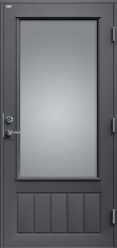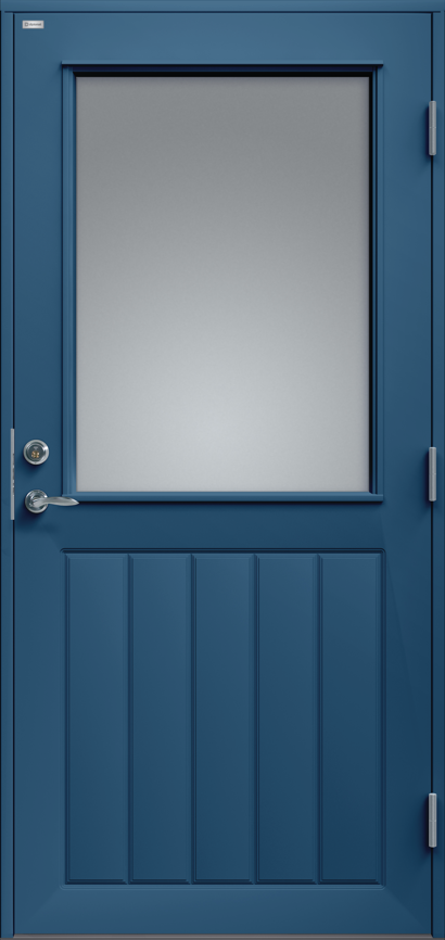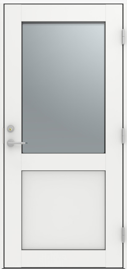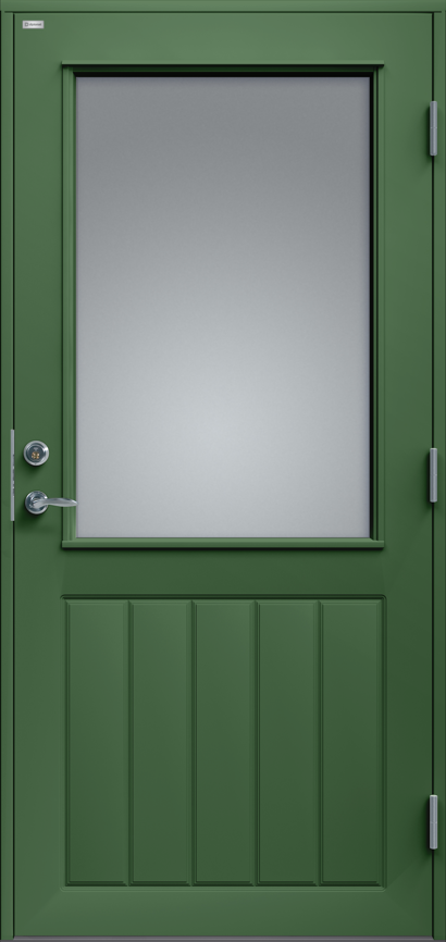 Halv parytterdörr i modern stil utan dekor. Byggd på laminatskiva som är extra väderbeständig och formstabil. Fyra liggande och ett stående klarglas i steppat utförande med limmad glaskassett, välj mellan glasram i svart eller silver. Rostfri sparkplåt.