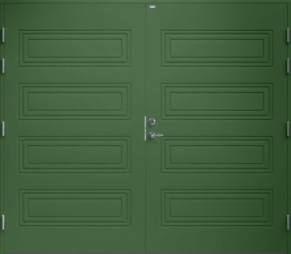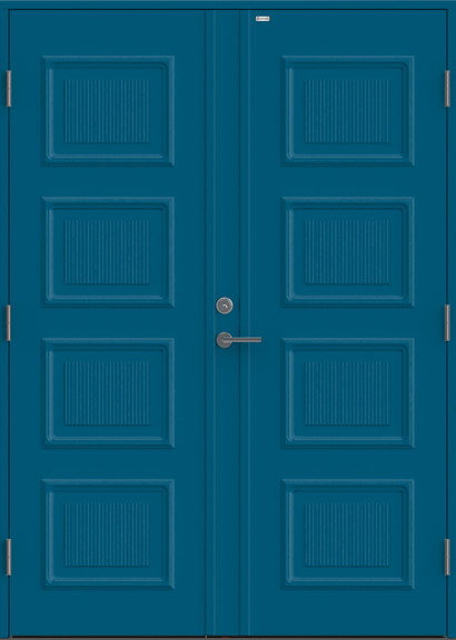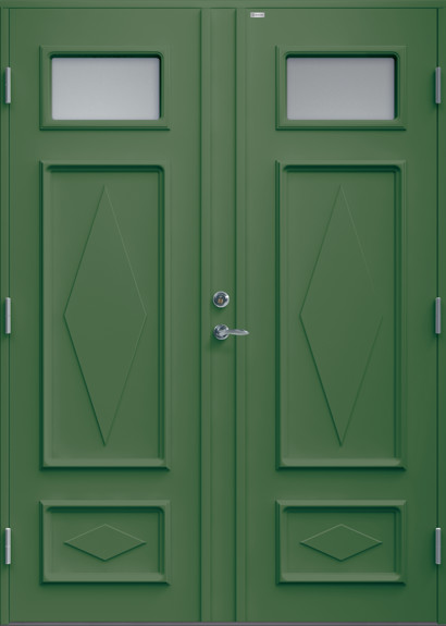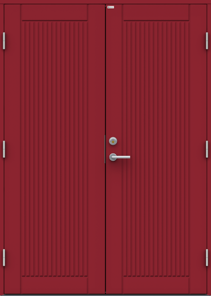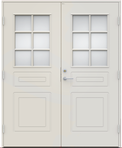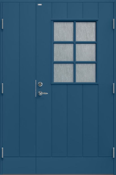 Parytterdörr med stående dekor och en extra djup profil som flirtar med funkis. Fyra små, kvadratiska klarglas per sida vilket ger dörren en modern karaktär.