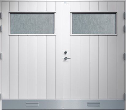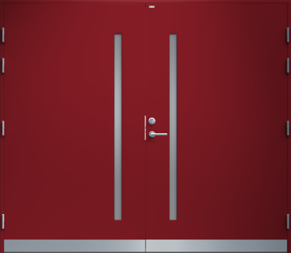 Parytterdörr i modern stil med slät yta helt utan dekor. Två smala, stående klarglas och rostfri sparkplåt.