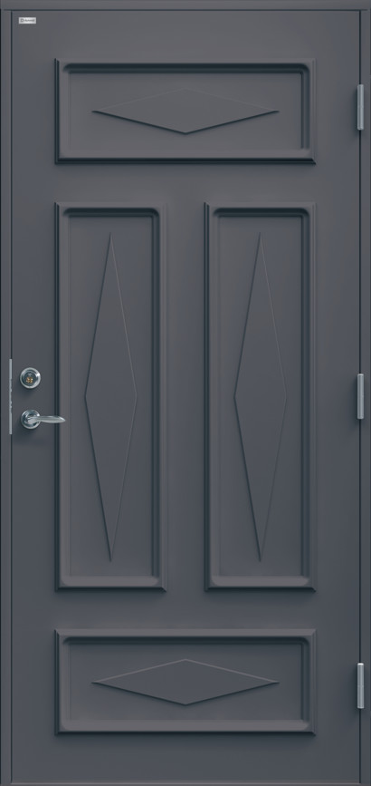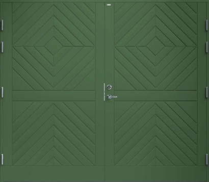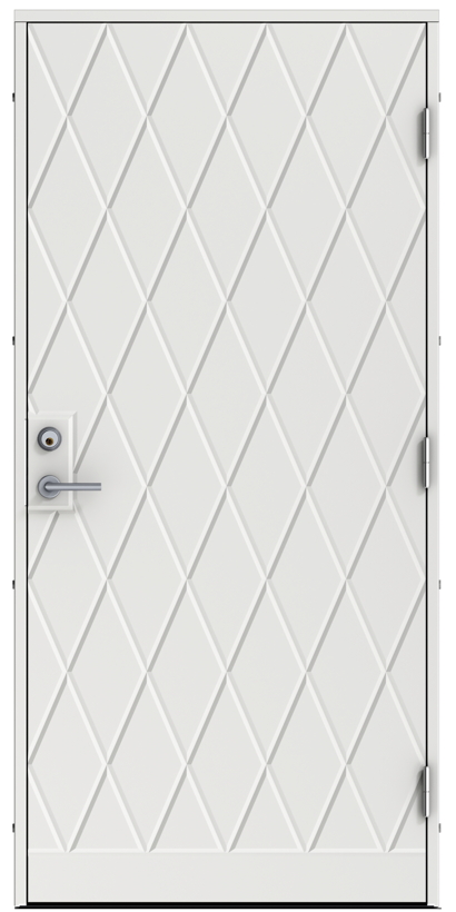 Ytterdörr i traditionell stil med diagonal panel i form av spårfräst dekor. Välj mellan valfri kulör eller furu.