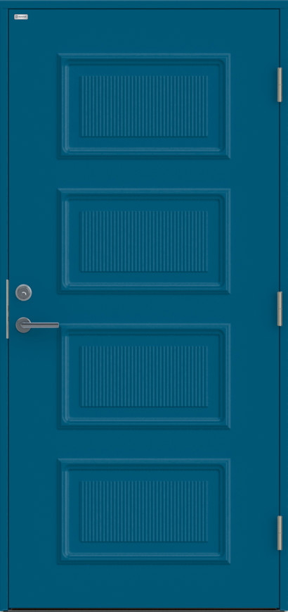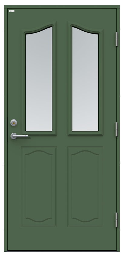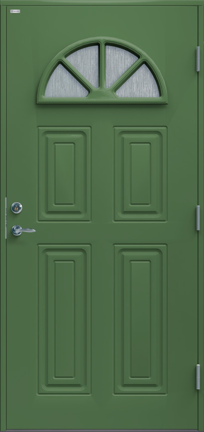 En klassisk ytterdörr med fyra utvändiga speglar med spår och utvändigt listverk. Finns i valfri kulör.