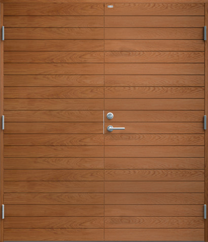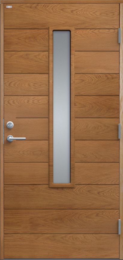 Ytterdörr i modern stil med spårfräst dekor i form av liggande panel. Finns i ek, konstteak eller kulör.