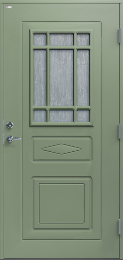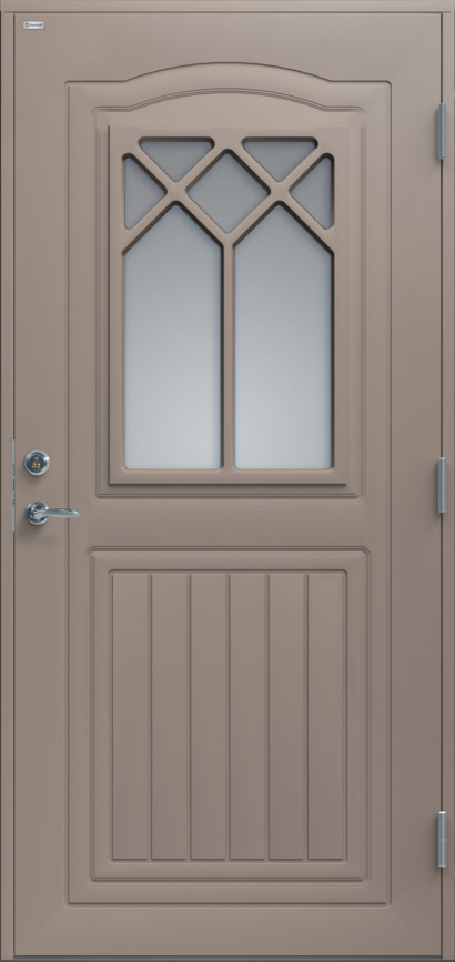Ytterdörr i traditionell stil med diagonal panel i form av spårfräst dekor samt cotswoldglas. Välj mellan valfri kulör eller furu.