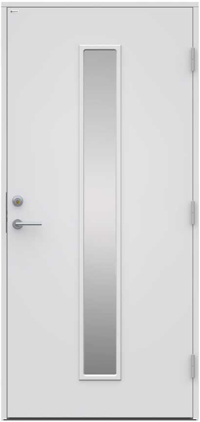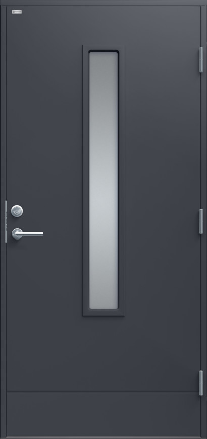 Ytterdörr i modern stil med slät yta och ett centrerat, stående klarglas.