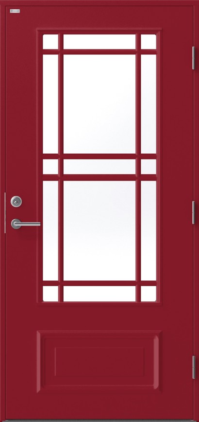 Ytterdörr med stående dekor och en extra djup profil som flirtar med funkis. Fyra små, kvadratiska klarglas vilket ger dörren en modern karaktär.