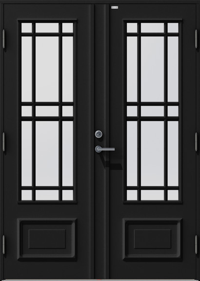 En klassisk dörr med utanpåliggande dekorer, klarglas, svarta gångjärn och löstagbara spröjs.