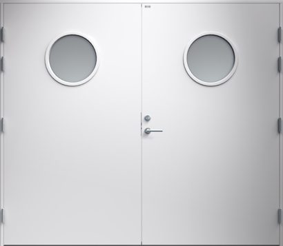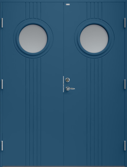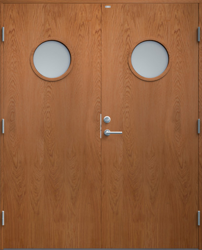 Parytterdörr med helt slät yta utan dekor och två runda klarglas. Välj mellan ek, konstteak eller valfri kulör.
