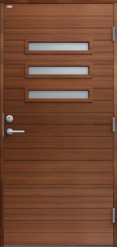 Ytterdörr i modern stil med tre horisontella klarglas. Spårfräst dekor i form av liggande panel. Finns i ek, konstteak eller valfri kulör.