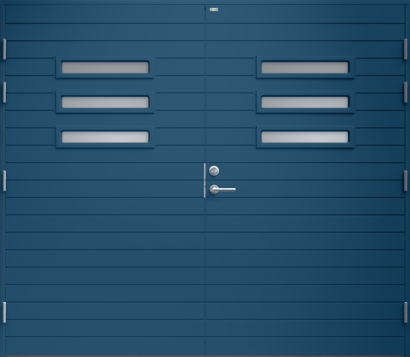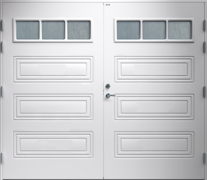 Garagedörr i modern stil med slät yta utan dekor. Fyra små, kvadratiska klarglas per sida och rostfri sparkplåt.