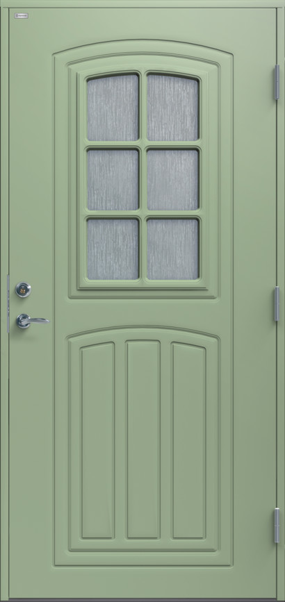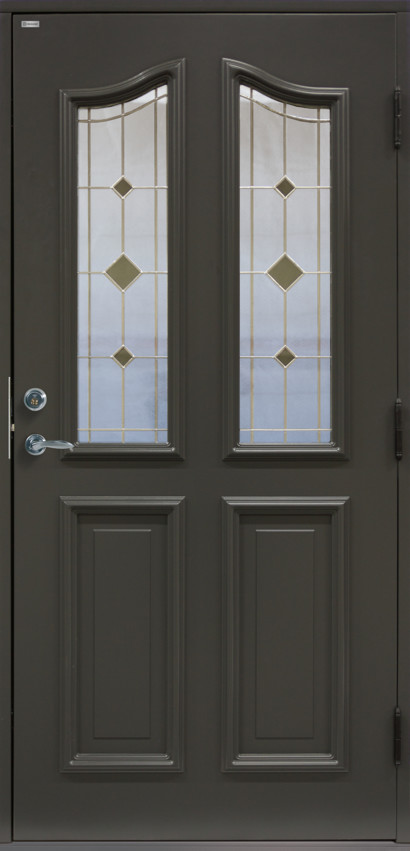 Ytterdörr i traditionell stil med speglar i form av spårfräst dekor.