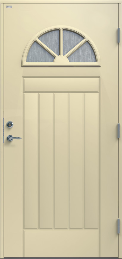 Ytterdörr i traditionell stil med spårfräst dekor och runt klarglas.
