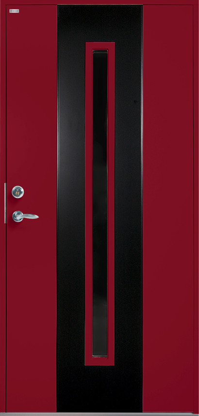 Ytterdörr i modern stil med slät yta och centrerade, stående klarglas.