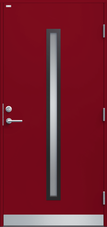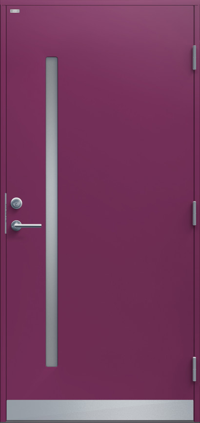 Ytterdörr i modern stil med slät yta helt utan dekor. Smalt, stående klarglas och rostfri sparkplåt.