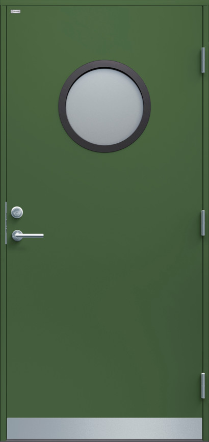 En dörr i modern stil med runda klarglas. Djupa stående dekorspår och en sparkplåt i aluminium.