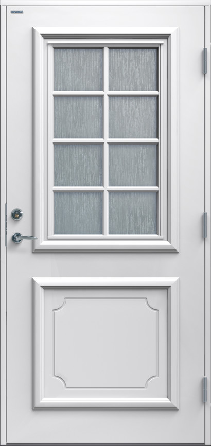 En klassisk ytterdörr med åtta utvändiga speglar med spår och utvändigt listverk. Klarglas i de två översta speglarna. Finns i valfri kulör.