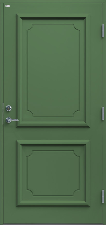 Klassisk ytterdörr med dörrspeglar markerade med lister. Välj mellan valfri kulör eller konstteak.