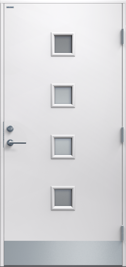 Ytterdörr i modern stil med slät yta utan dekor. Fyra små, kvadratiska klarglas och rostfri sparkplåt.