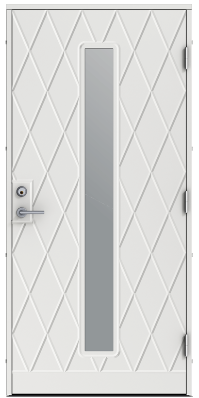 Ytterdörr i modern stil med högt, smalt klarglas. Utvändig dekor med djup profil i 6mm HDF-skiva.