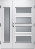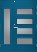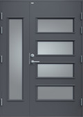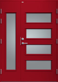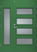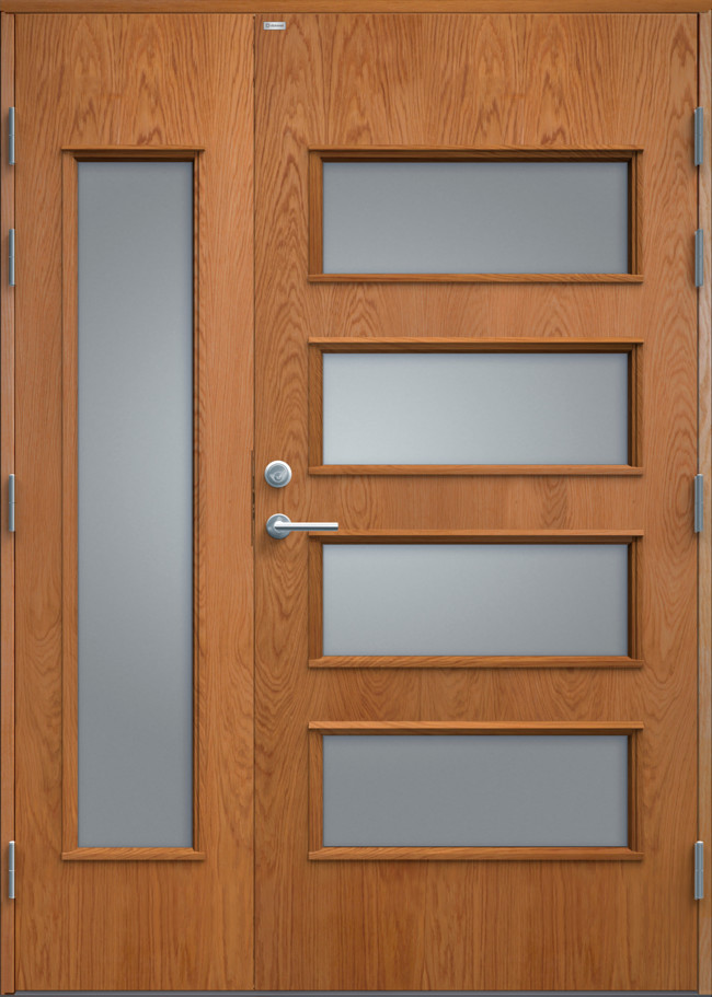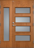 Elegant ytterdörr helt utan dekor. Dörren har fyra lite större, liggande klarglas samt stående sidoljus i samma stil. Välj mellan valfri kulör, konstteak eller ek.