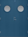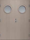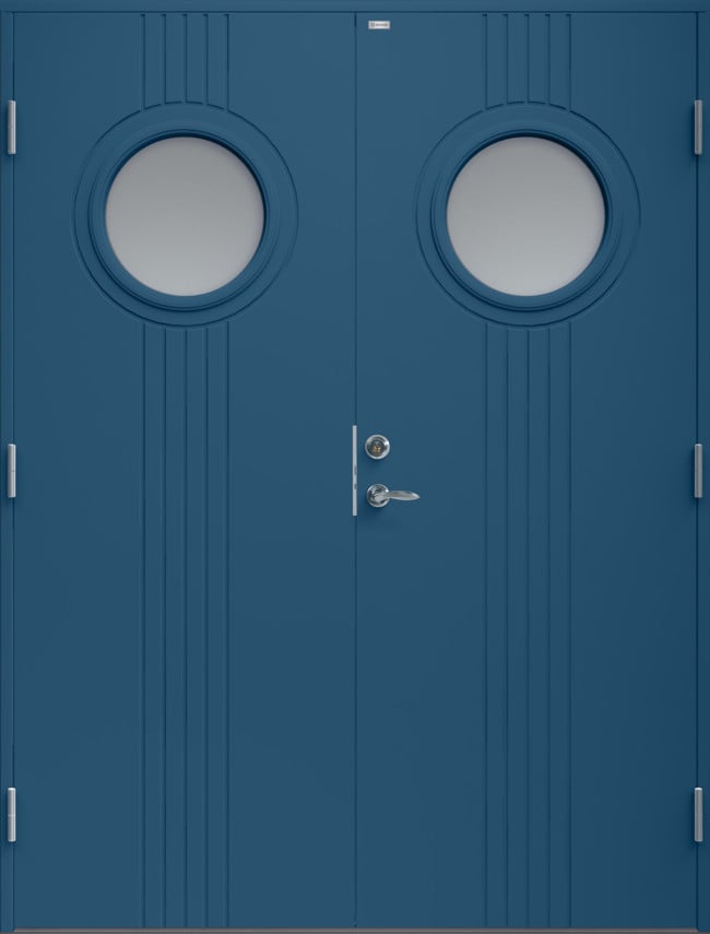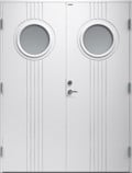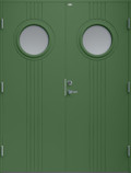Ytterdörr i traditionell stil med spårfräst dekor och två runda klarglas.