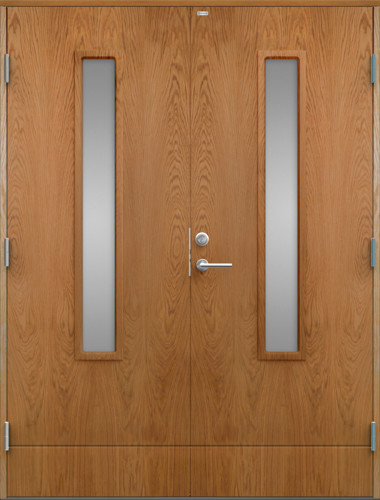 Parytterdörr i modern stil med sparsmakad dekor och två smala, stående klarglas.