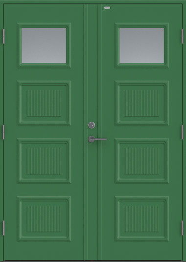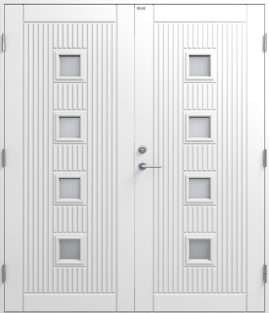 Parytterdörr i modern stil med slät yta utan dekor. Fyra små, kvadratiska klarglas per sida och rostfri sparkplåt.