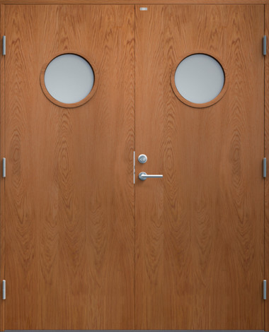 Parytterdörr med helt slät yta utan dekor och två runda klarglas. Välj mellan ek, konstteak eller valfri kulör.