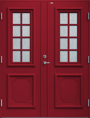 Parytterdörr med stående dekor och en extra djup profil som flirtar med funkis. Fyra små, kvadratiska klarglas per sida vilket ger dörren en modern karaktär.