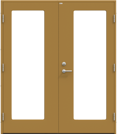 Pardörr i modern stil med slät yta och två stora, stående klarglas med rundade hörn.
