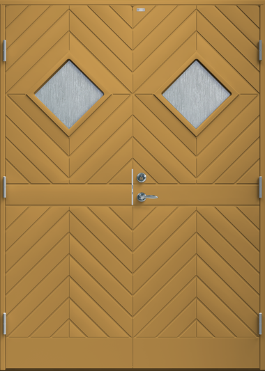 Pardörr i traditionell stil med diagonal panel i form av spårfräst dekor samt två cotswoldglas.