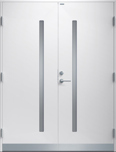 Parytterdörr i modern stil med slät yta helt utan dekor. Två smala, stående klarglas och rostfri sparkplåt.