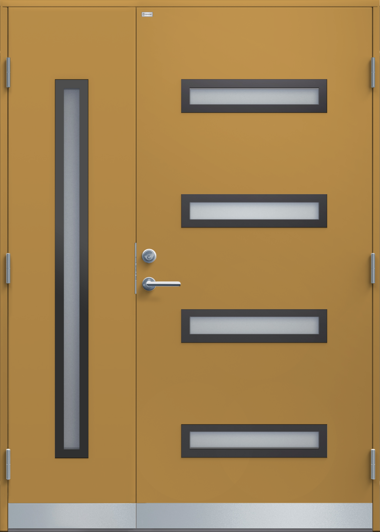 Pardörr i modern stil med enkelt dekorspår i nederkant och två smala, stående klarglas.
