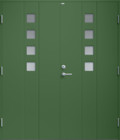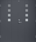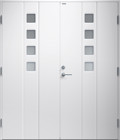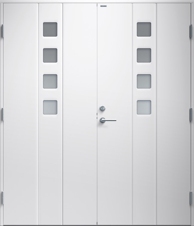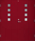 Parytterdörr i modern stil och dekorspår med djup profil i 6mm HDF-skiva. Fyra små, kvadratiska klarglas per sida.