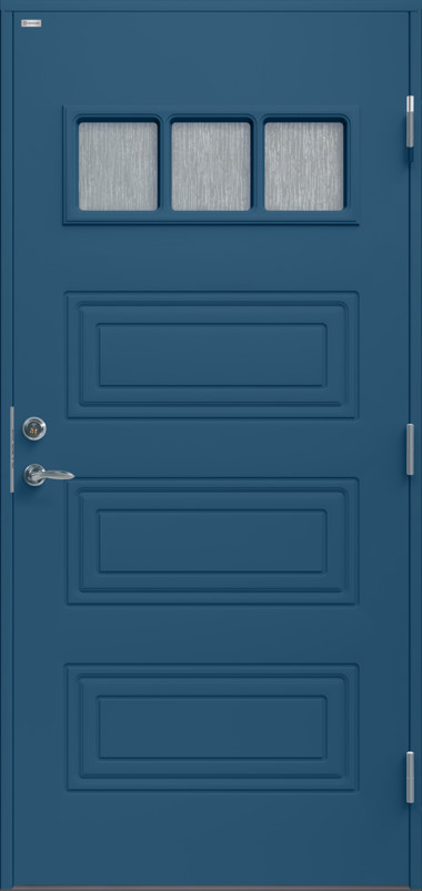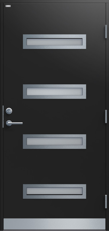 Ytterdörr i modern stil utan dekor. Byggd på laminatskiva som är extra väderbeständig och formstabil. Fyra liggande klarglas i steppat utförande med limmad glaskassett, välj mellan glasram i svart eller silver. Rostfri sparkplåt.